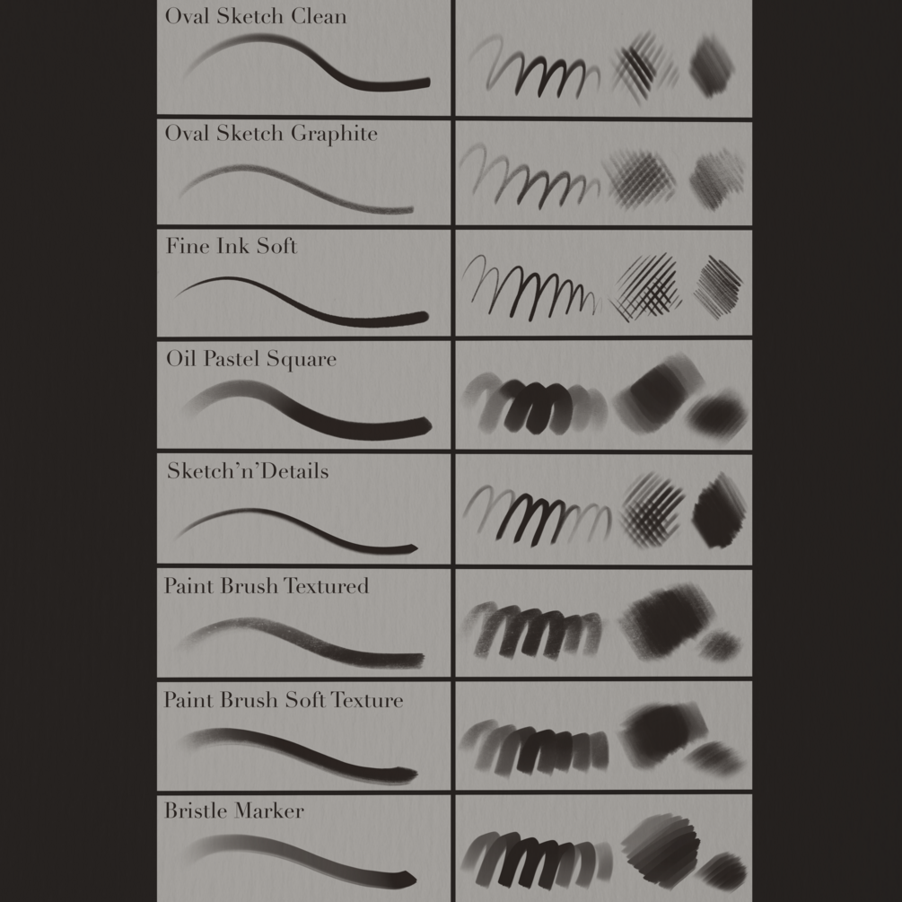 - Oval Sketch Graphite: this brush texture is very similar to the one of a graphite pencil; I personally love the feeling this brush conveys and I’ve been using it a lot for sketching lately!